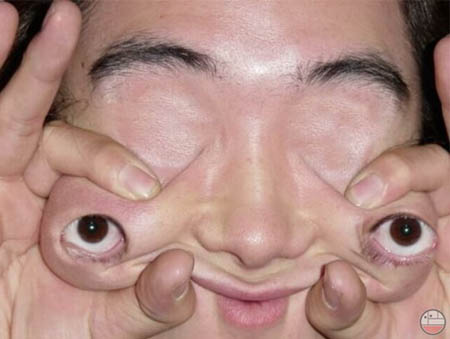جن جنون الفريق القادم من موسوعة جينيس لمشاهدة هذا المنظر الذي يدخل التاريخ ويحطم الرقم القياسي في هذا المجال . توم جيرمي يستعرض امامهم شيئا لم يتخيله احد . يمسك عينيه بيديه يشدهم ويسحبهم الى الاسفل ويخرجهم خارج الفجوات المعدة لهما . وكما تلاحظون في الصورة ان الامر لا يبدو منطقيا , وهذا هو الشيء الذي يجعله من رواد الارقام القياسية . حقا مدهش .